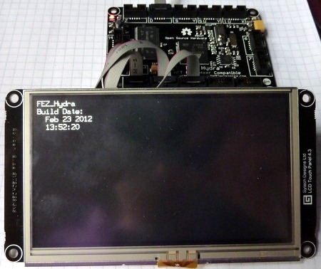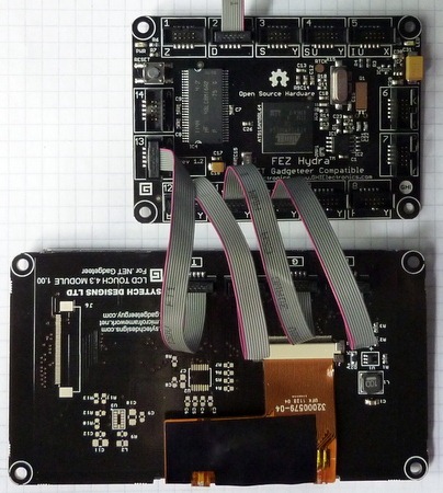 The .NET Micro Framework supports pixel displays like LCDs in two ways. You can do GDI-like operations to draw directly on the display using the Bitmap class, or you can do somewhat more clever stuff using a trimmed-down version of the WPF libraries. We’ll do a bit of both. Firstly, you need to set up the hardware. I’m using a Fez Hydra main board, but you could use a Nano or a Spider. The display is a Sytech 4.3" LCD touch panel. You could use a different (read: cheaper) LCD, but you might have to adjust various sizes in the code to make the program fit the display. the LCD requires four connectors to the main board: three for data and control, and one to retrieve input from the touch panel. The wiring is straightforward: