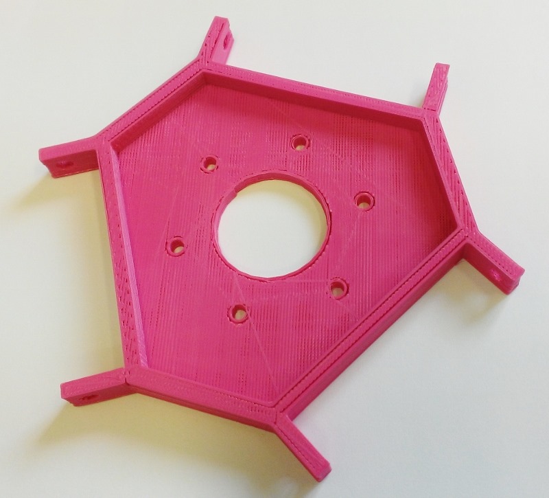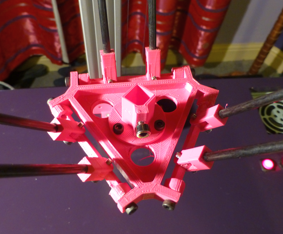 I could buy a printer or a kit, but that would be too easy. Instead, I’m working on my own design for a printer similar to the marvellous Rostock printer. While most 3D printers are based on a cartesian framework (moving the print head along X,Y and Z axes), Rostock is based on the delta robot design. In this scheme, the print head is suspended from three arms, as if it’s at the point of an upside-down pyramid. By driving each of the arms up and down independently, the print head can be moved very quickly over quite a large volume. Delta robots can move very quickly, because generally the masses of the moving parts can be kept low.