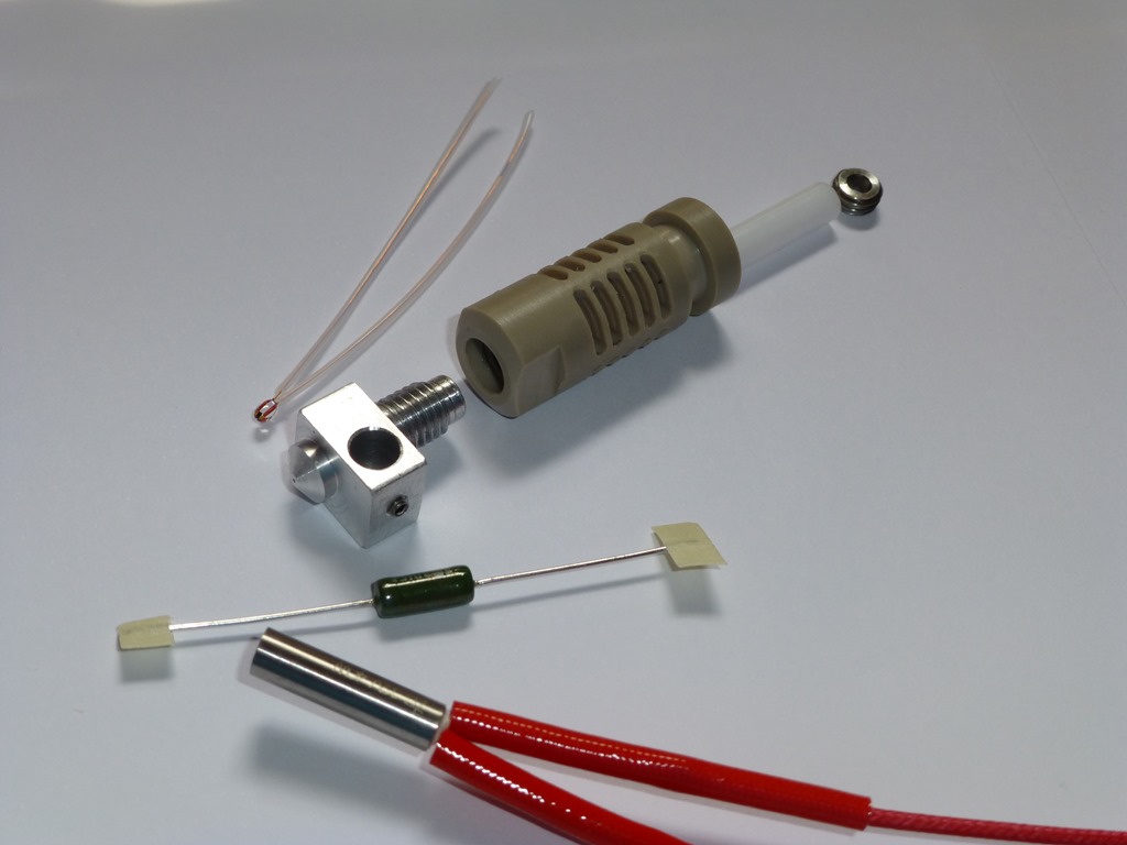 The hot end parts have arrived. I’ve gone for a popular design, the J-head Mk V. In an exploded view, it looks like this: